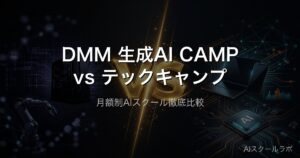 | DMM 生成AI CAMP | 月額16,280円 | ChatGPT・Dify・画像/動画生成 等 | 動画+実践課題 | 最大70% |